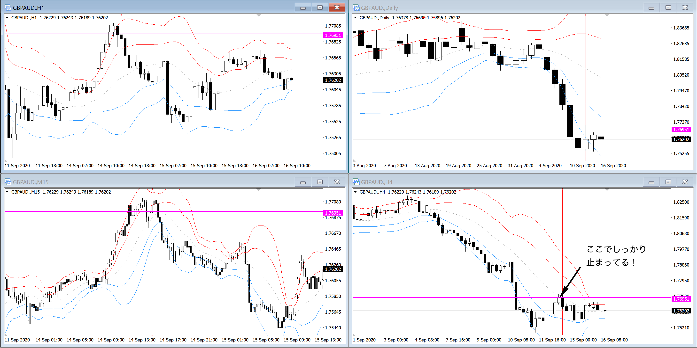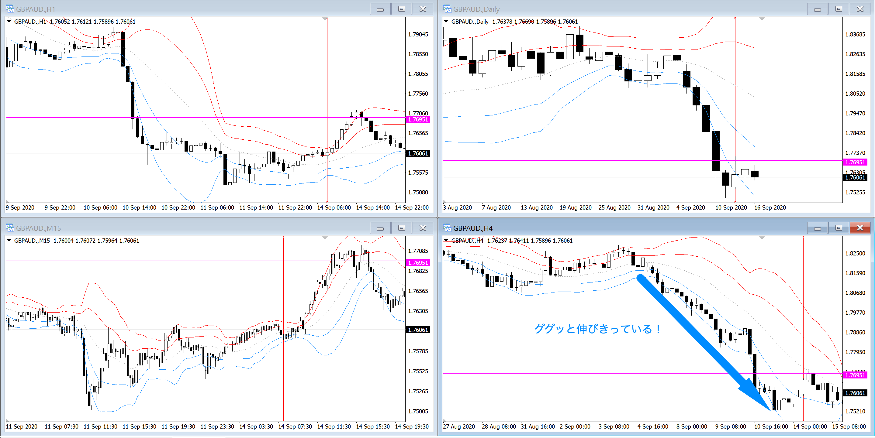 これを見てみると4時間足もしっかり伸びきっていて戻るスペースが十分あります。