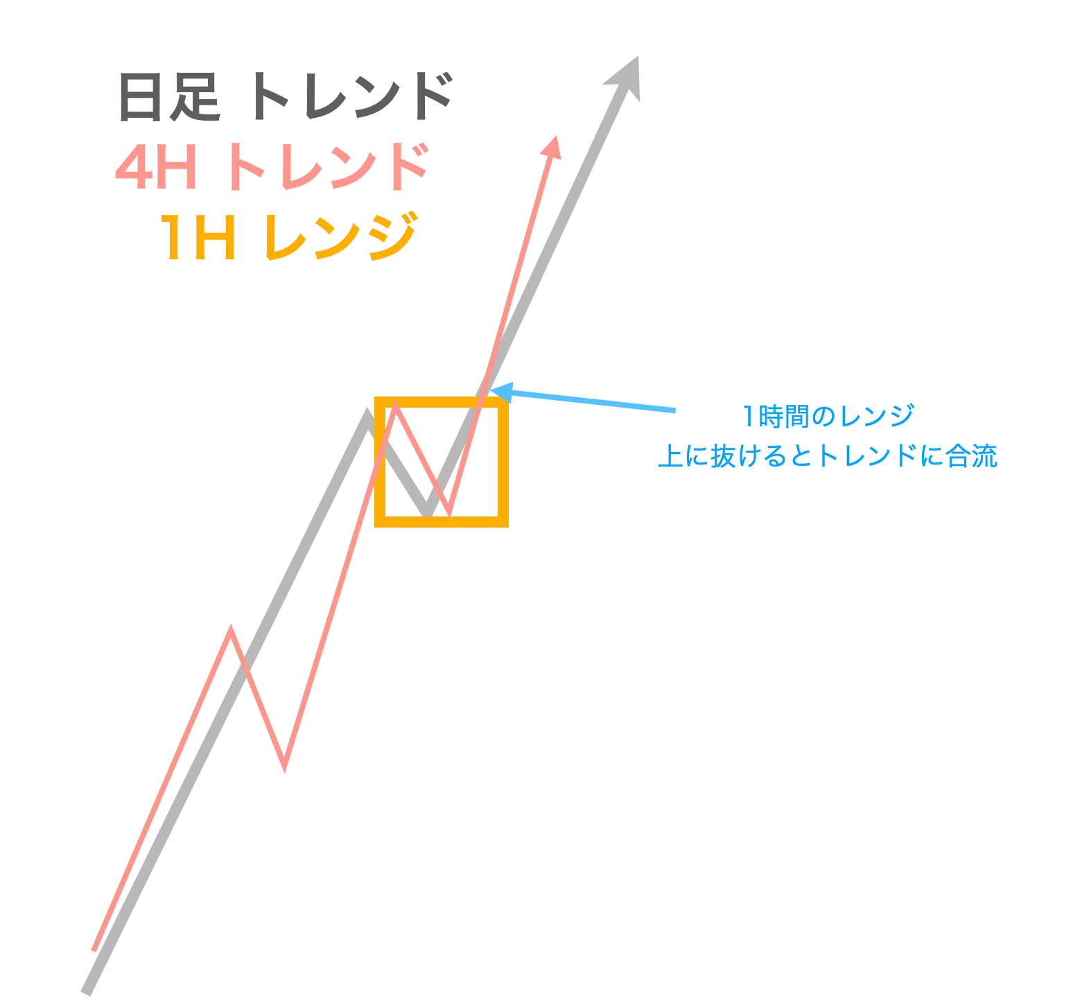 1時間足〜日足まで、トレンドなので、レンジ内部からエントリーしてもおっけーです。