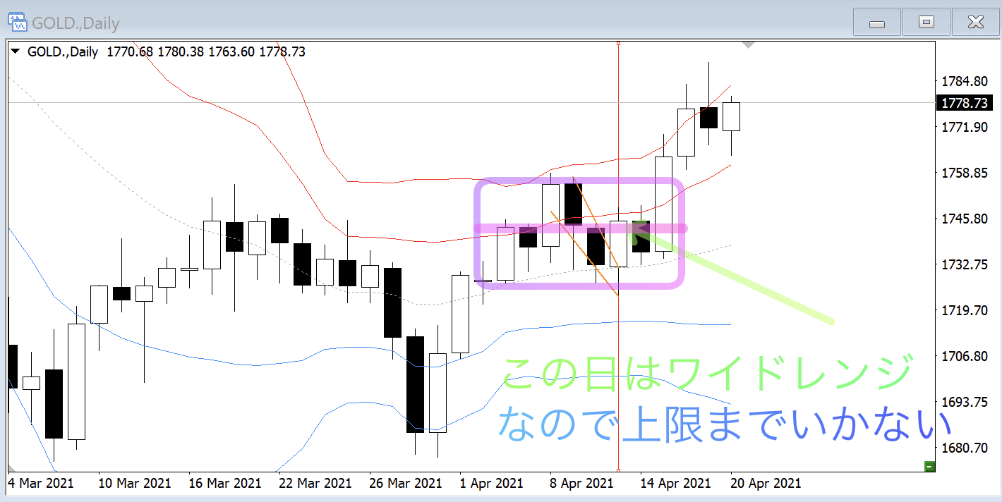 日足がワイドレンジになっているため、上限まで行かずに半分あたりで止まっています。
