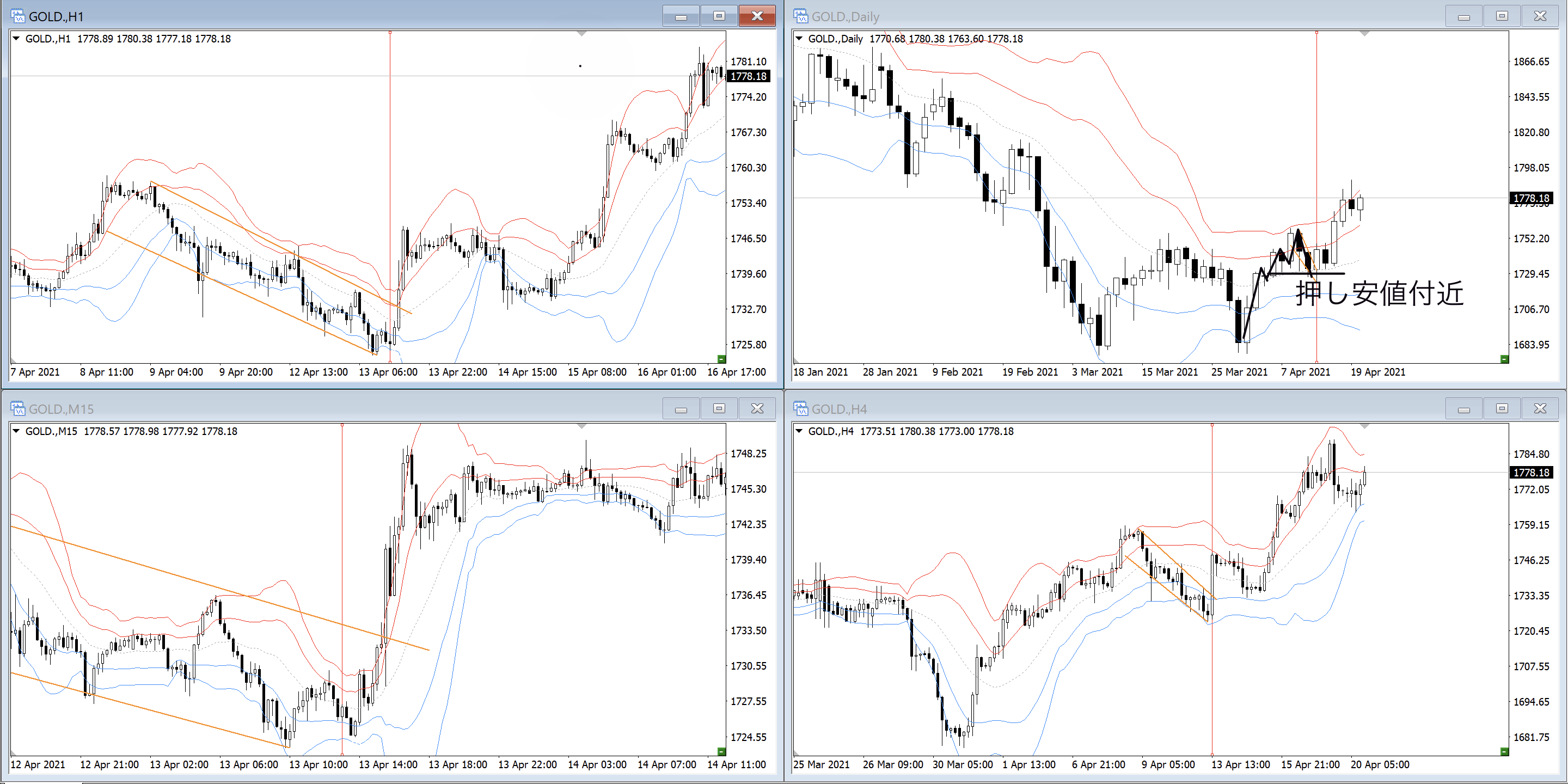 状況的にいうと日足の押し安値付近にレートがある状態です。