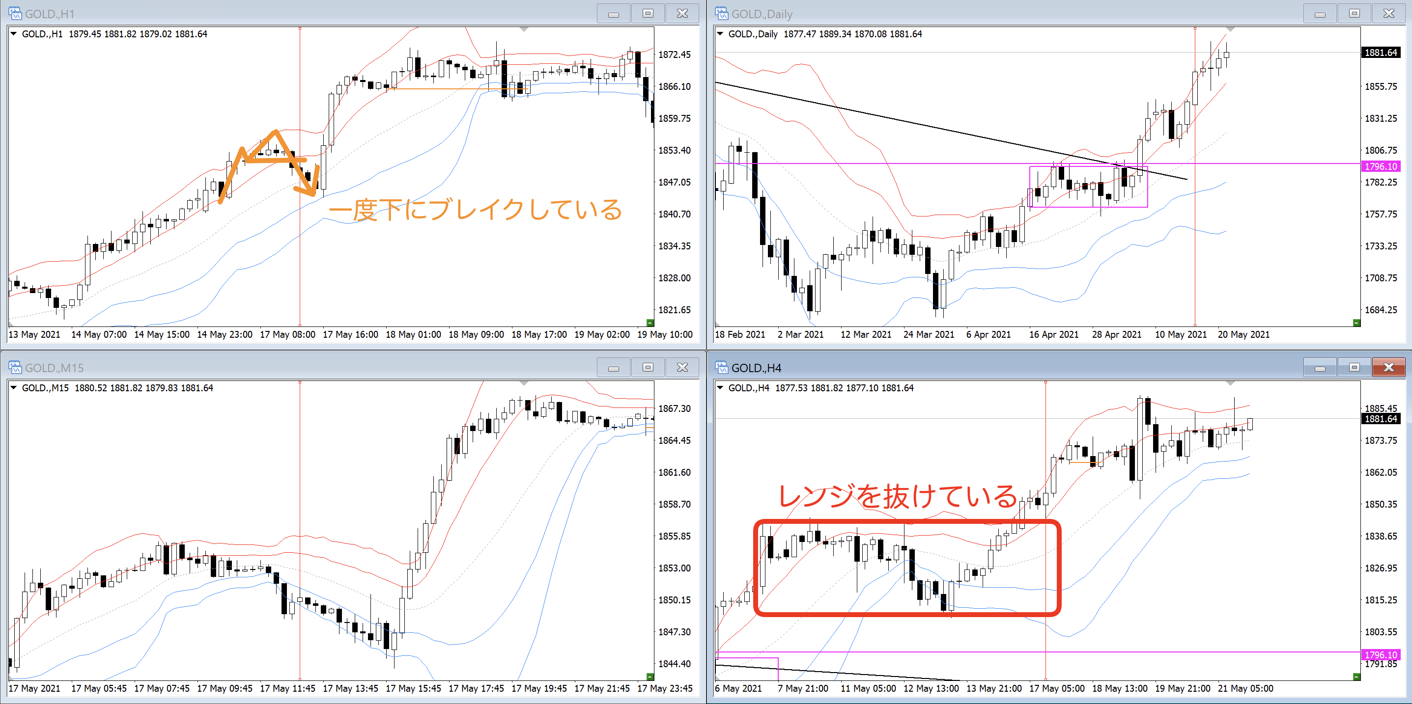 4時間足以下見ると一度、レンジ帯を抜けています。