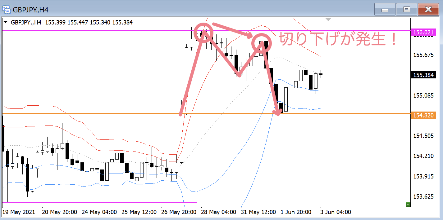今回は高値の切り下がりでしたが、高値の切り下がりはとても重要なポイントですが、もう一つのパターンを紹介します
