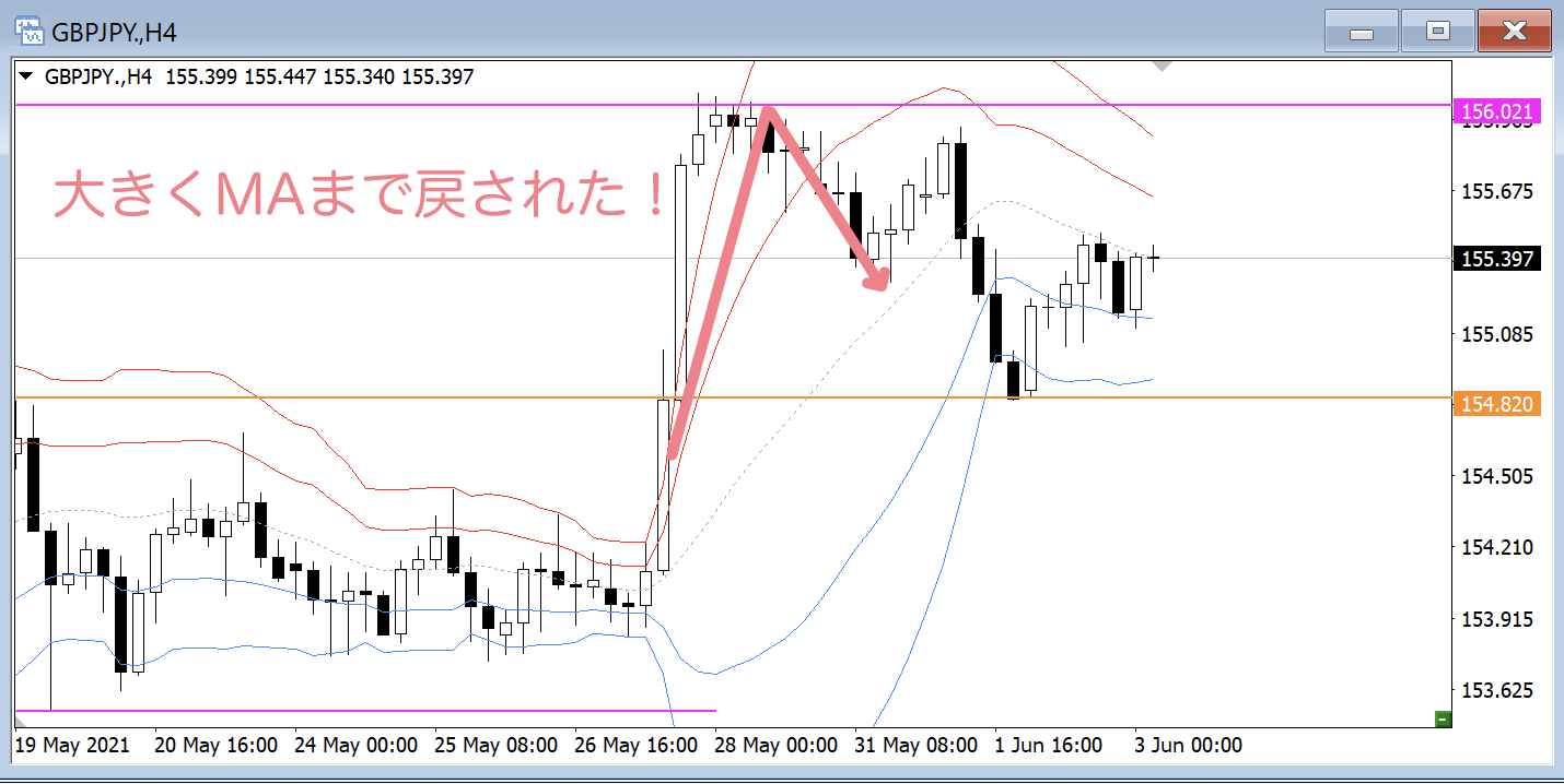 よくみるとトレンドだったものが、一度、大きく下げてMA付近まで近づいています