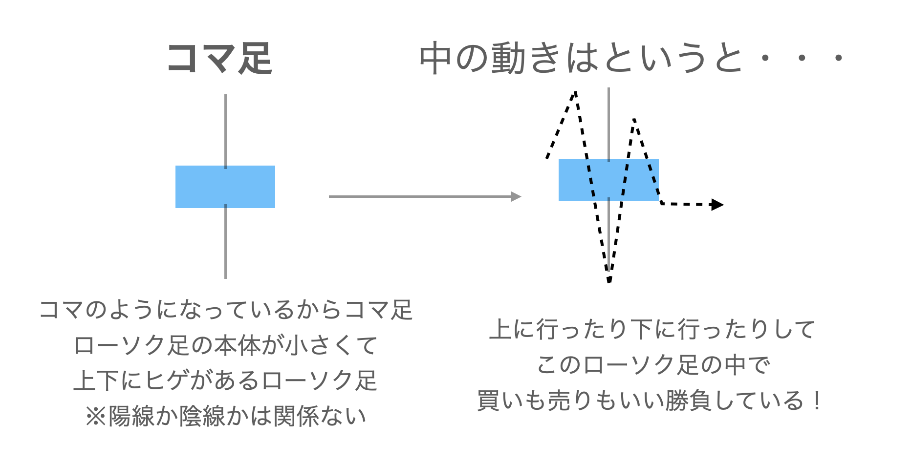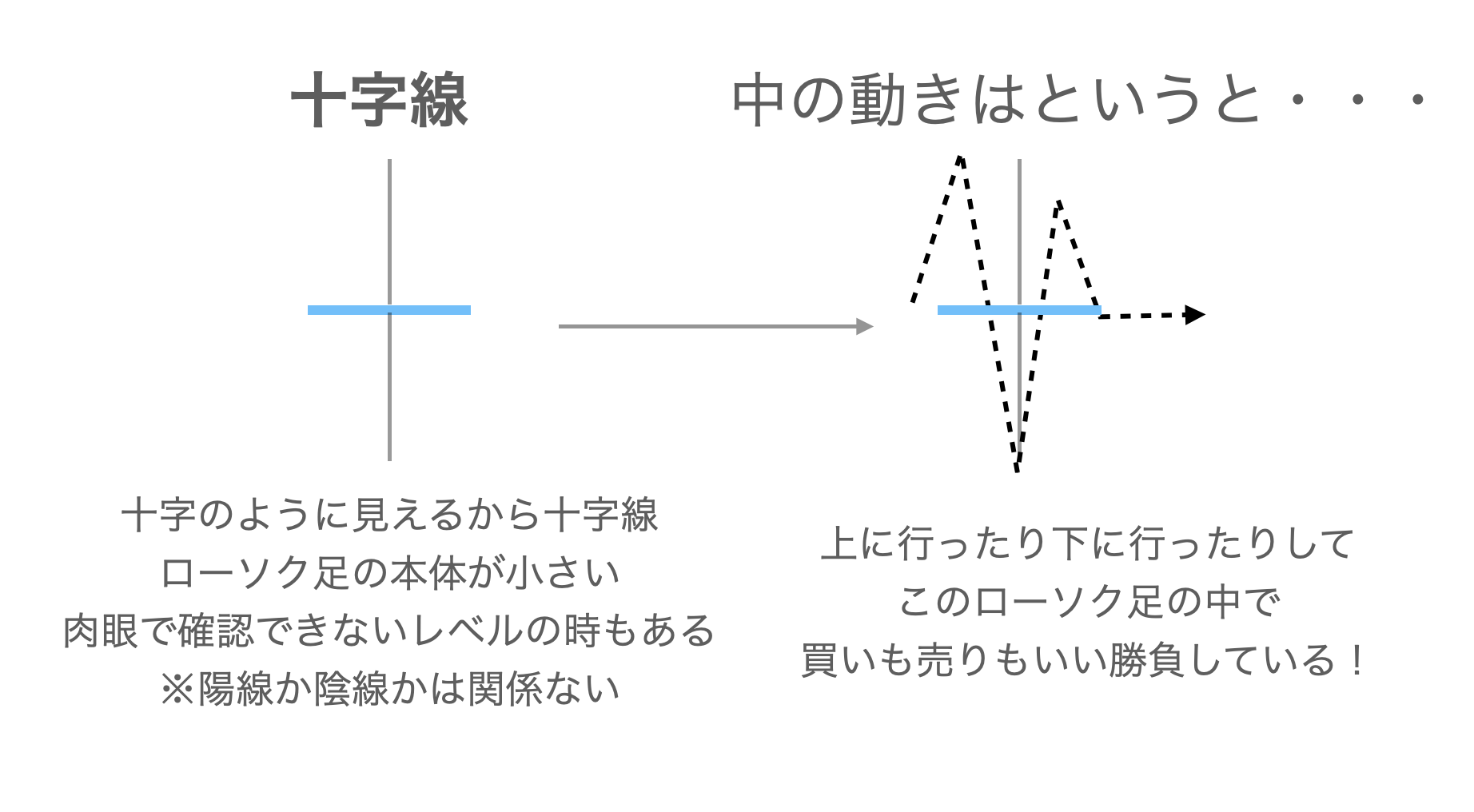 [chat face=”34cf68e053d52afc75e91fc17e7cf18b.png” name=”にゃんこ先生” align=”left” border=”blue” bg=”none”]ここでは、コマ足や十字線の中で買いと売りがバトルしてて、引き分けくらいになってんやーって覚えておいて^^[/chat]