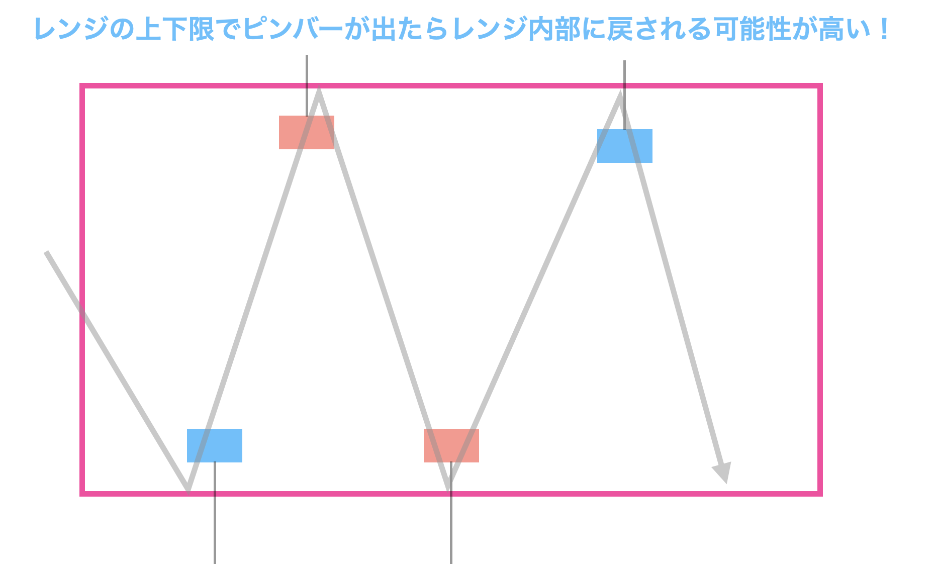 例えば下の図のように、レンジ下限でピンバーが出たとしたらそこから切り返してくるサインです。