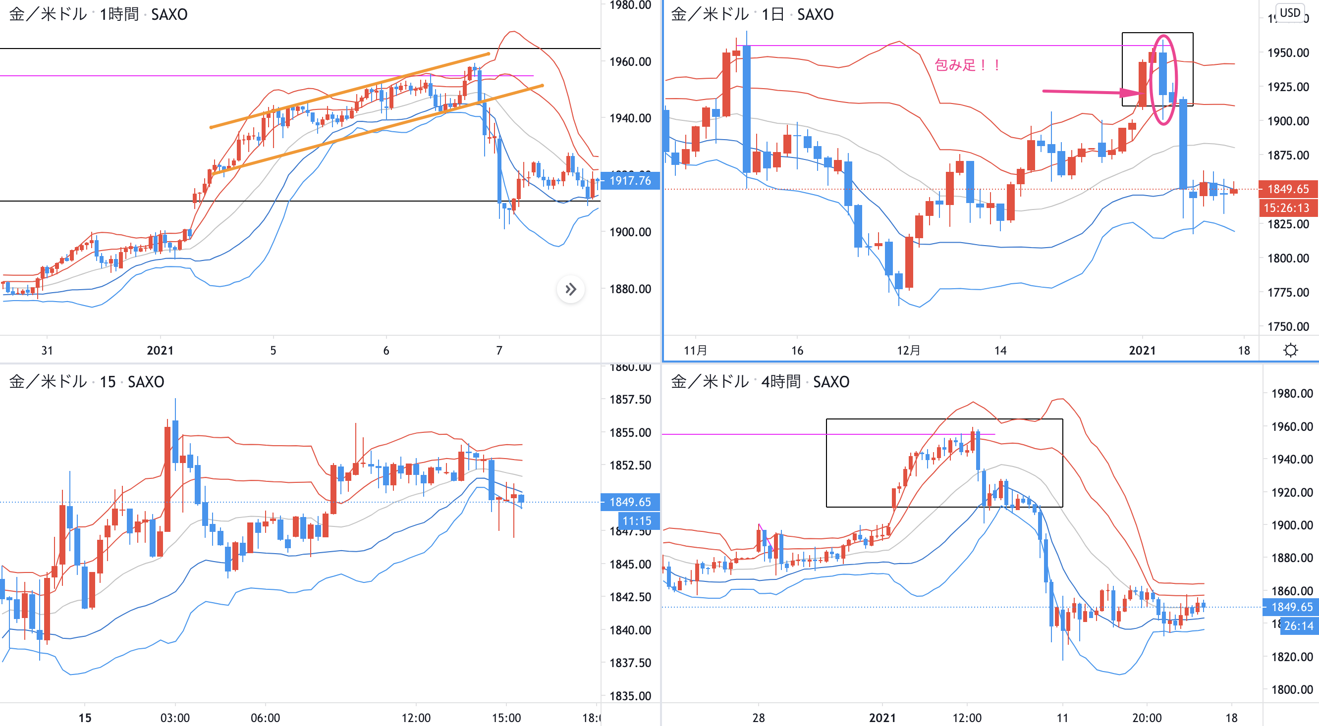 また強いトレンドが出ている時に大きく包み足のように切り返してきたら、一旦流れが弱くなっているサインです。